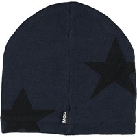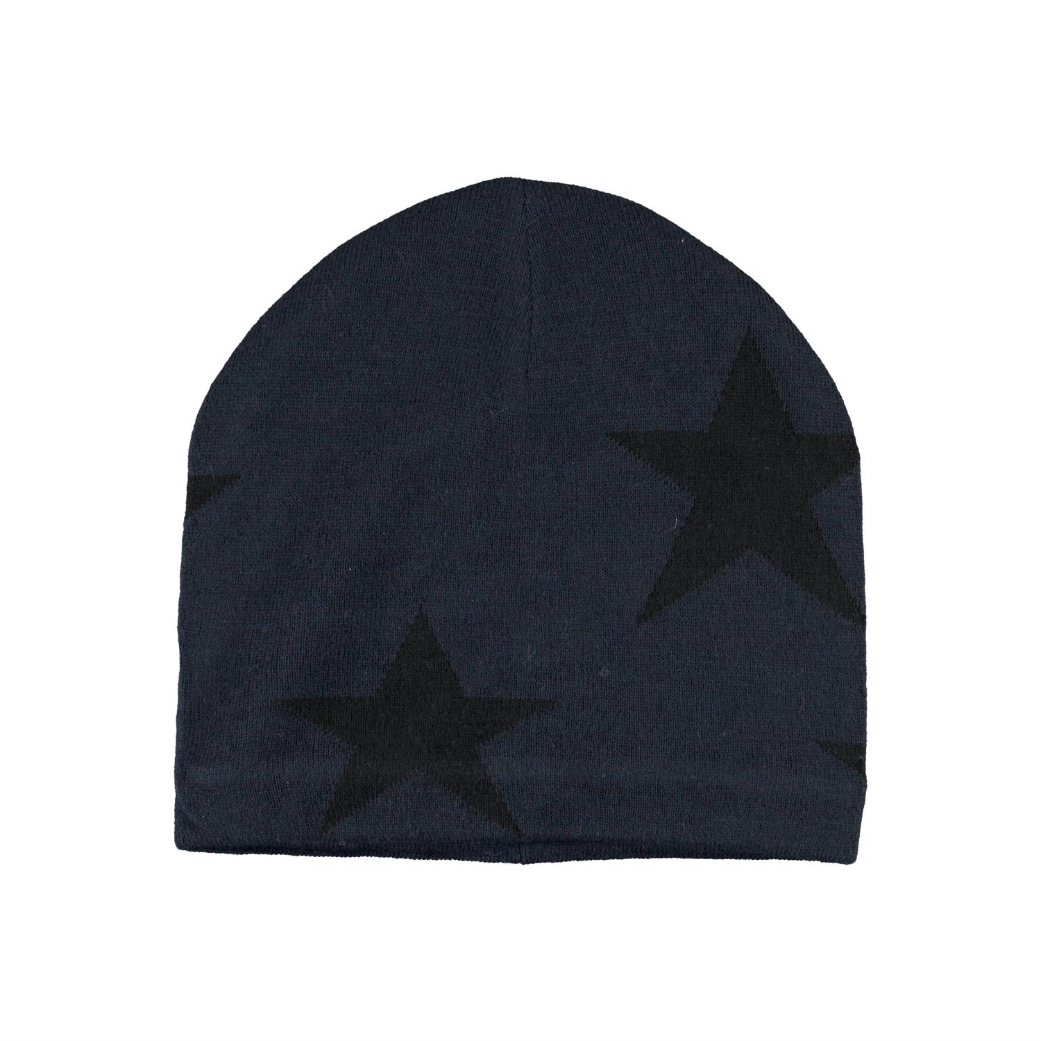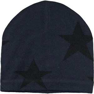 Mørkeblå hue i en blød uldmix med indstrikkede stjerner og ribkant forneden.