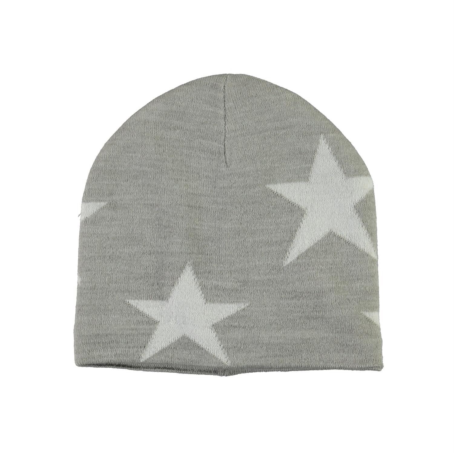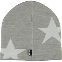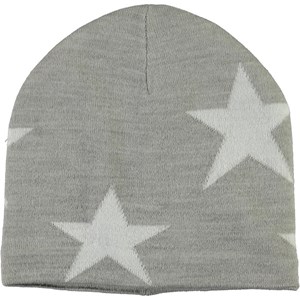 Grå hue i en blød uldmix med indstrikkede stjerner og ribkant forneden.
