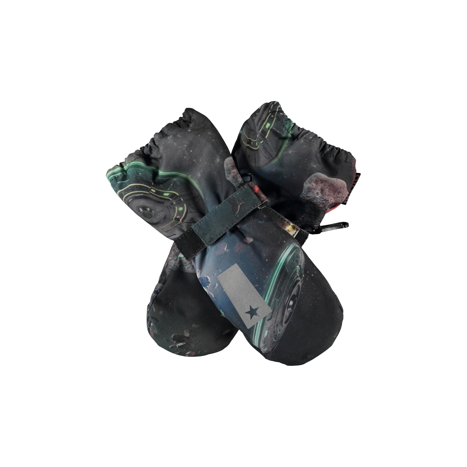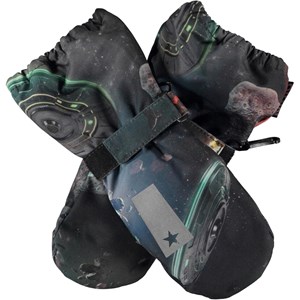 Blå vinterhandsker med print af rumskibe. På indersiden af handsken og ved tommelfingeren er der sorte gummibelægninger, der giver en god gribehåndflade. Handskerne egner sig godt til alt slags vejr og er perfekte både til hverdagen eller skiferien. Derudover matcher handskerne med Molo’s overtøj i farver og print. Skaftet på denne model er en smule længere end på Mitzy, så der ikke kommer en åbning ved jakkeærmet. Bemærk at str. 1-2 år har lynlås i skaftet i stedet for velcrolukning.