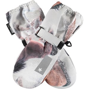 Lysegrå vandtætte og åndbare luffer med print af heste. Lufferne har med 3M™ Thinsulate™ isolering, stjernerefleks på forsiden, samt elastik og justerbar velcro ved håndleddet. Ydermaterialet er fremstillet af 45% recycled polyester, 3M™ Thinsulate™ foret er fremstillet af 78% recycled polyester og inderstoffet af 100% recycled polyester. Bemærk, at skaftet på denne model er en smule længere end på Mitzy, således at der ikke kommer en åbning ved jakkeærmet. Dette produkt har en vandafvisende PFC-friimprægnering (indeholder f.eks. ikke PFOS, PFOA og lignende). Vandsøjletryk: 10.000 mm. Åndbarhed: 8.000 g/m2/24t. Bemærk at str. 1-2 år har lynlås i skaftet i stedet for velcrolukning.