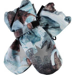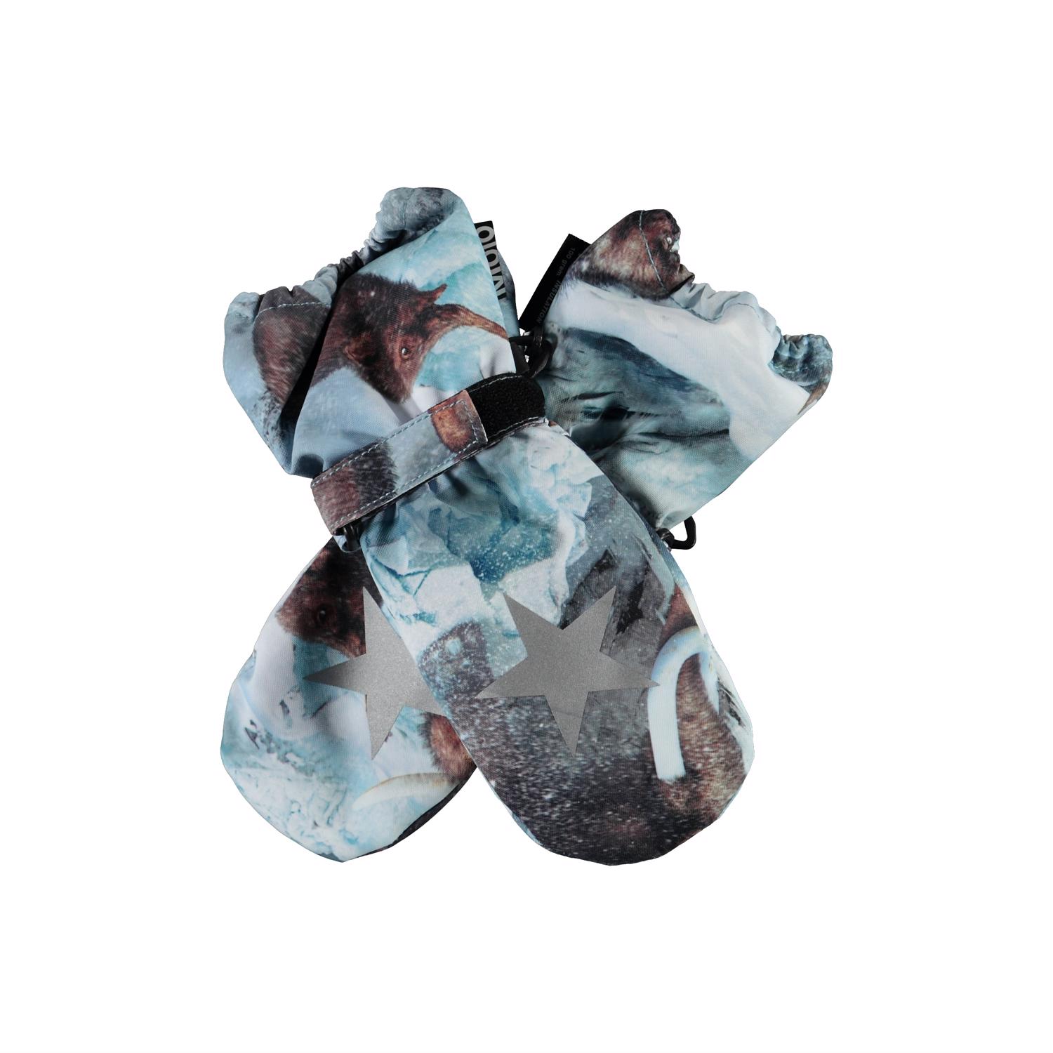 Vandtætte og åndbare luffer med 3M™ Thinsulate™ isolering i lyseblå med print af mammutter. Lufferne er i sort og har en stjernerefleks på forsiden, samt elastik og justerbar velcro ved håndleddet. Bemærk, at skaftet på denne model er en smule længere end på Mitzy, således at der ikke kommer en åbning ved jakkeærmet. Dette produkt har en vandafvisende PFC-fri imprægnering (indeholder f.eks. ikke PFOS, PFOA og lignende). Vandsøjletryk: 10.000 mm. Åndbarhed: 8.000 g/m2/24t. Størrelserne 1-2 år har desuden lynlås i skaftet.