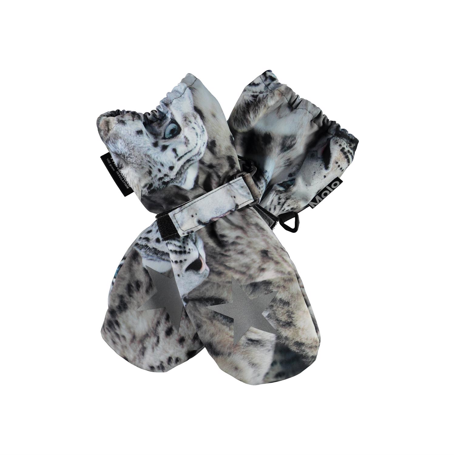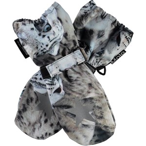 Vandtætte og åndbare luffer med 3M™ Thinsulate™ isolering med print af sneleoparder. Lufferne er i sort og har en stjernerefleks på forsiden, samt elastik og justerbar velcro ved håndleddet. Bemærk, at skaftet på denne model er en smule længere end på Mitzy, således at der ikke kommer en åbning ved jakkeærmet. Dette produkt har en vandafvisende PFC-fri imprægnering (indeholder f.eks. ikke PFOS, PFOA og lignende). Vandsøjletryk: 10.000 mm. Åndbarhed: 8.000 g/m2/24t. Størrelserne 1-2 år har desuden lynlås i skaftet.