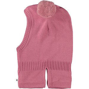 Strikket elefanthue i pink med faux-fur pomponer. Huen har indsnit ved halsen, der sikrer, at den sidder perfekt over bryst og skuldre. Fremstillet i en blød uldblanding.