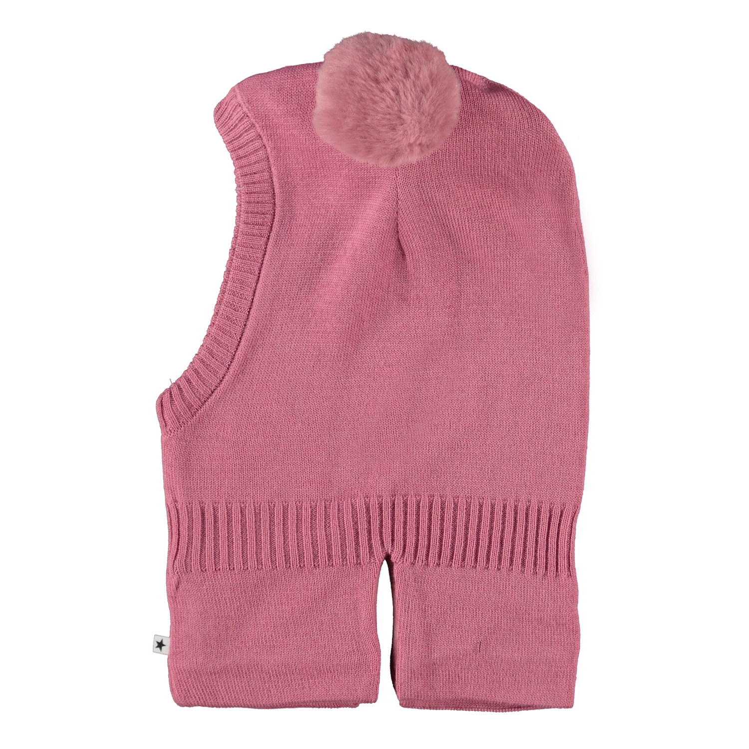 Strikket elefanthue i pink med faux-fur pomponer. Huen har indsnit ved halsen, der sikrer, at den sidder perfekt over bryst og skuldre. Fremstillet i en blød uldblanding.