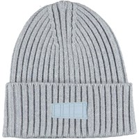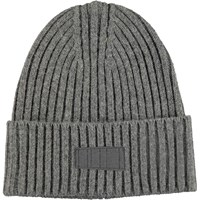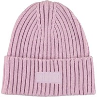 Kabelstrikket beige hue i uldmix med ombuk forneden og Molo's logo på fronten.