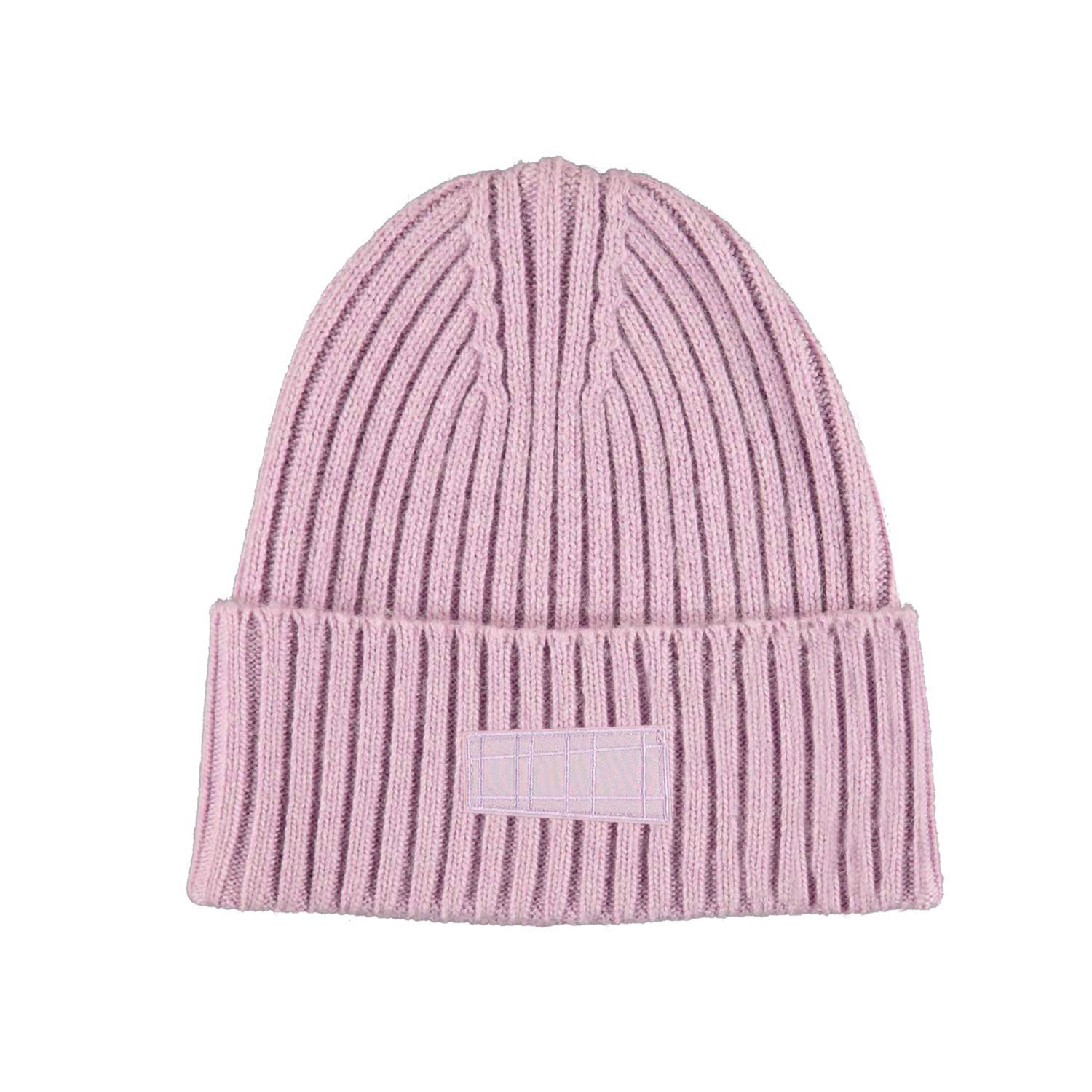 Kabelstrikket rosa hue i uldmix med ombuk forneden og Molo's logo på fronten.