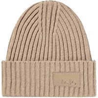 Mørkeblå ribstrikket hue med ombuk, og Molo's logo på fronten.