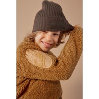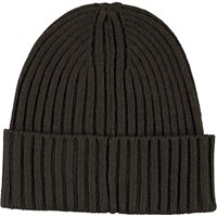 Kabelstrikket grøn hue i uldmix med ombuk forneden og Molo's logo på fronten.