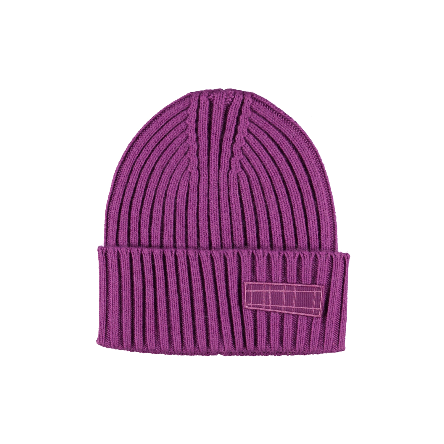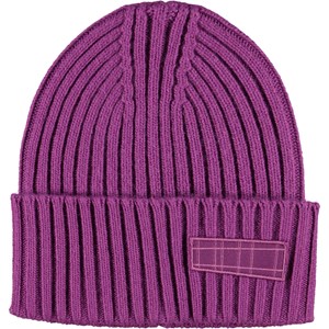 Kabelstrikket lilla hue i uldblanding med ombuk forneden og Molo''s logo på fronten.