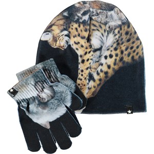 Matchende sæt med hue og fingerhandsker med print af leopard. S/M: 3-6 år. M/L: 7-12 år.