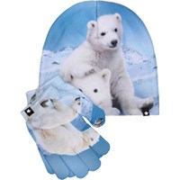 Mørkeblåt sæt med hue og fingerhandsker med dinoprint. Str. S/M 3-6 år. Str. M/L 7-12 år.