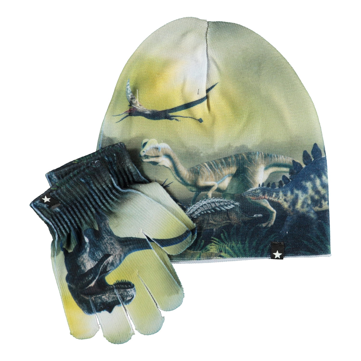 Matchende sæt med hue og fingerhandsker med print af forskellige dinosaur. S/M: 3-6 år. M/L: 7-12 år.