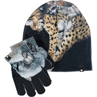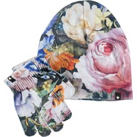Matchende sæt med hue og fingerhandsker med print af jordkloden set fra rummet. S/M: 3-6 år. M/L: 7-12 år.