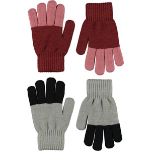 To par forede strik handsker. Det ene par er røde med lyserøde fingre, mens det endet par er grå med sorte fingre.