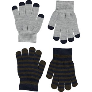 To par strik handsker. Det ene par er grå med sorte finger spidser, mens det andet par er stribede i blå og grøn.