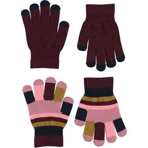 To par strik handsker. Det ene par er bordeaux rød med mørkeblå finger spidser, mens det andet par er stribede i mange farver.