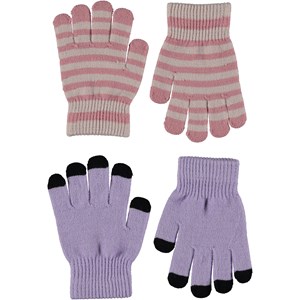 To par strik handsker. Det ene par er lilla med sorte finger spidser, mens det andet par er stribede i rosa og lyserød.