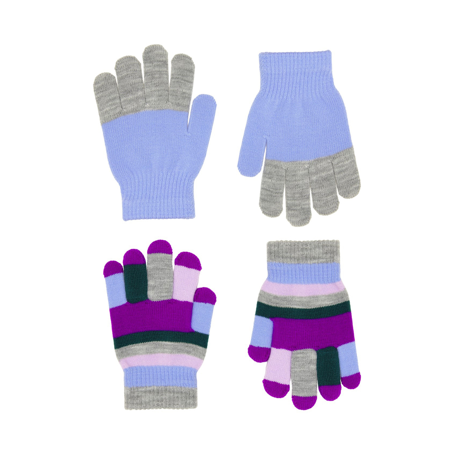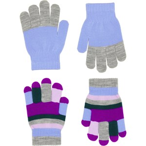 2-pak strikhandsker, det ene par er blålilla med grå detaljer, mens det andet par er stribet i grå, lyserøde og lilla nuancer. Handskerne har en ribkant om håndledet der gør dem behagelige at have på og ikke glider af hånden.