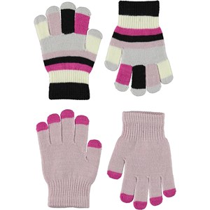 To par strik handsker. Det ene par er rosa med pink finger spidser, mens det andet par er stribet.