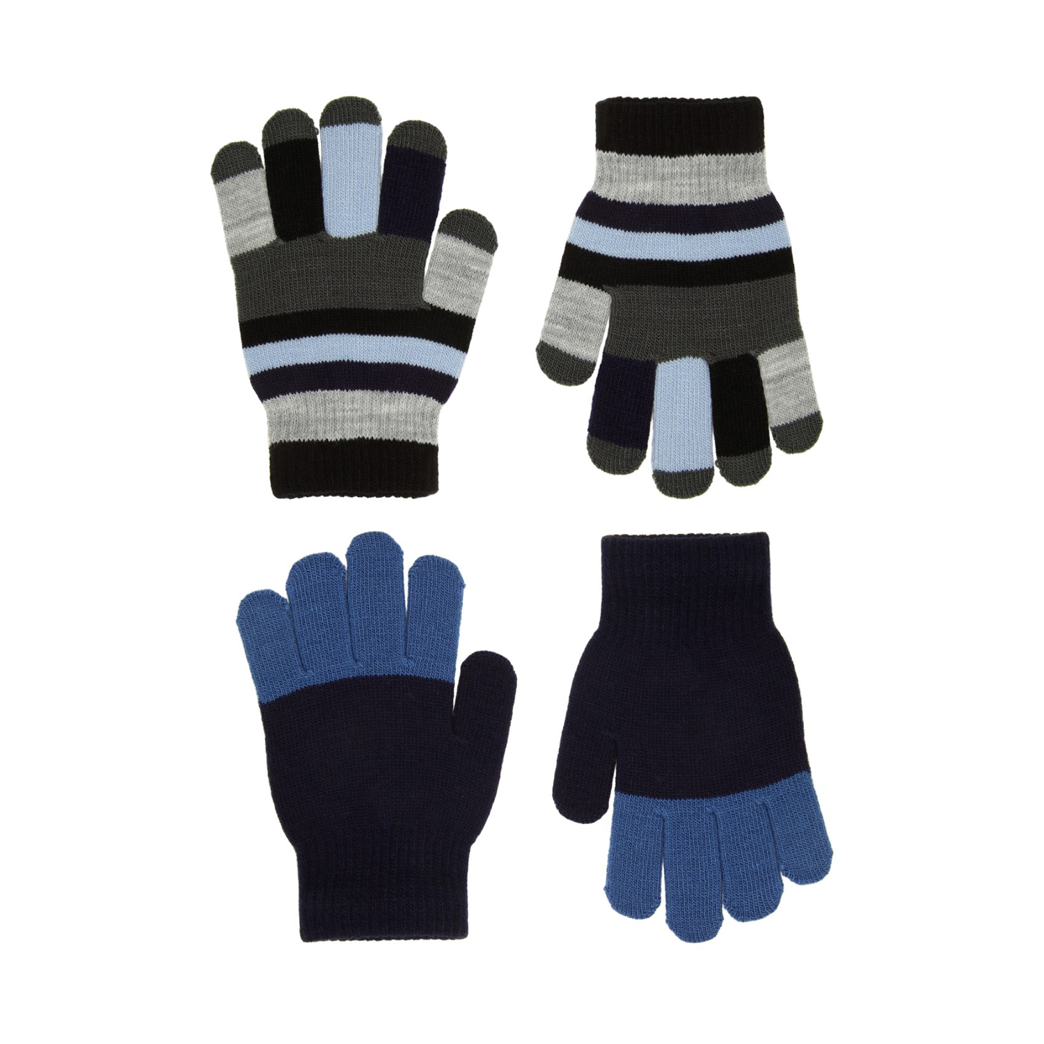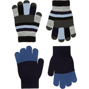 2-pak strikhandsker, det ene par er sorte med blå detaljer, mens det andet par er stribet i sorte, grønne, grå og lyseblå farver. Handskerne har en ribkant om håndledet der gør dem behagelige at have på og ikke glider af hånden.