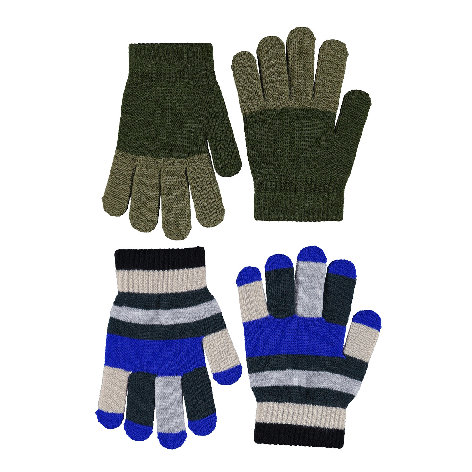 2-pak strikhandsker. Det ene i grønne nuancer og det andet i blå, sort, beige og grå striber. Handskerne har en ribkant om håndleddet der gør dem behagelige at have på og ikke glider af hånden.