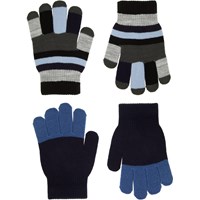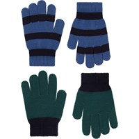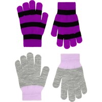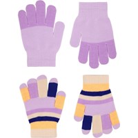 2-pak strikhandsker, det ene par er beige med råhvide detaljer, mens det andet par er stribet i mørkeblå og lilla. Handskerne har en ribkant om håndledet der gør dem behagelige at have på og ikke glider af hånden.