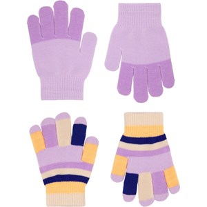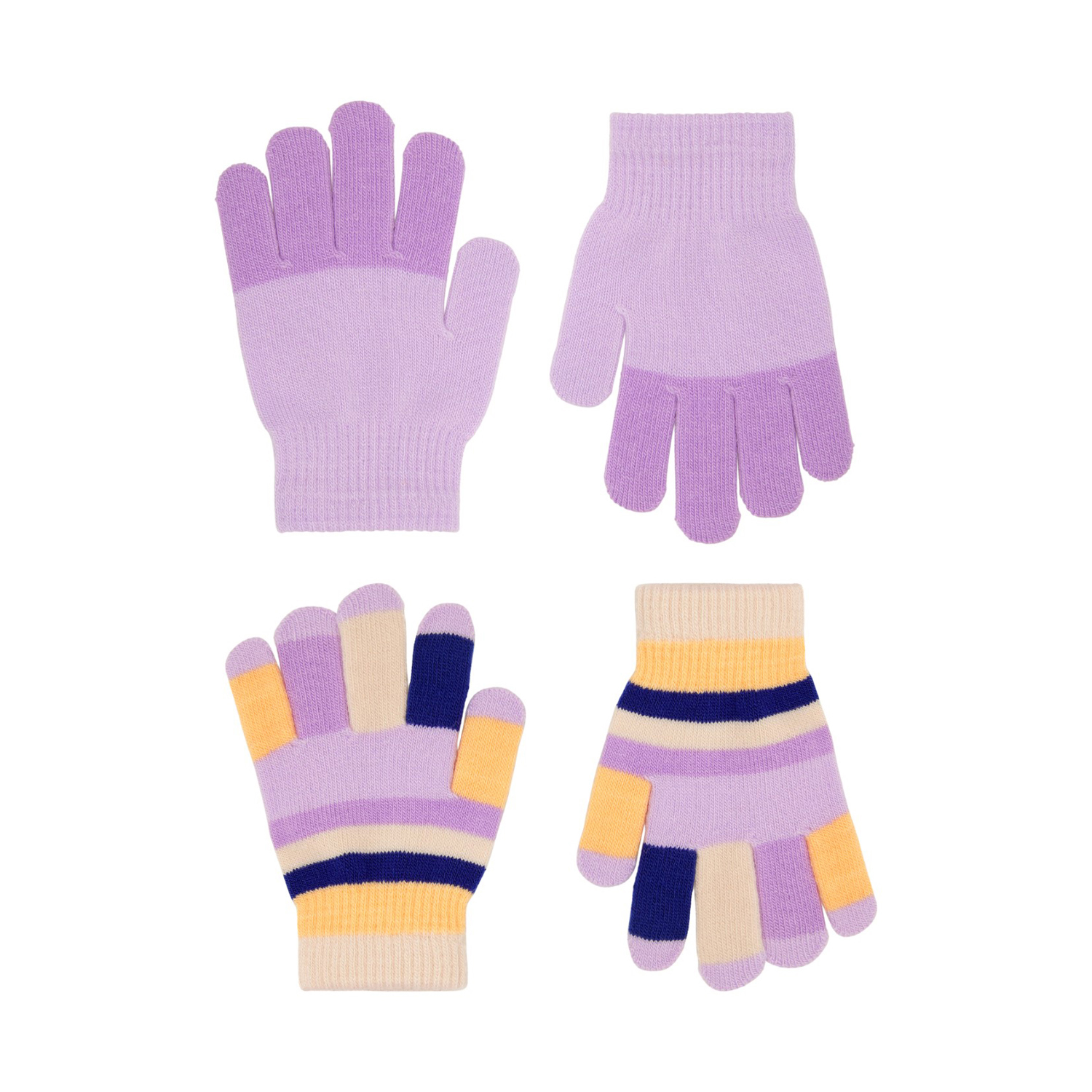 2-pak strikhandsker, det ene par er lyslilla med lillapink detaljer, mens det andet par er stribet i gule, mørkeblå, råhvid og lilla nuancer. Handskerne har en ribkant om håndledet der gør dem behagelige at have på og ikke glider af hånden.