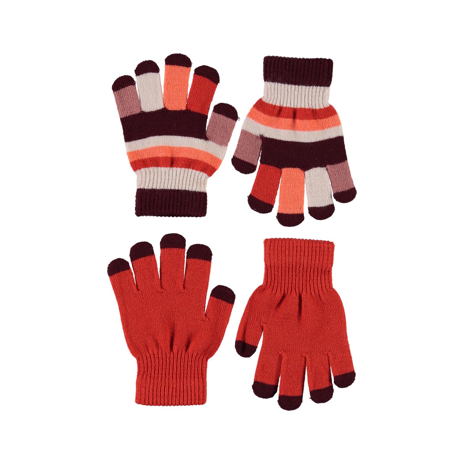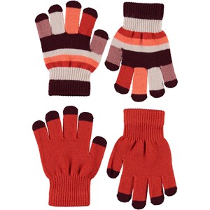 To par strik handsker. Det ene par er orange med mørke finger spidser, mens det andet par er stribede.