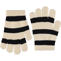 2-pak strikhandsker. Det ene i grå og beige og det andet i sorte og cremefarvede striber. Handskerne har en ribkant om håndleddet der gør dem behagelige at have på og ikke glider af hånden.