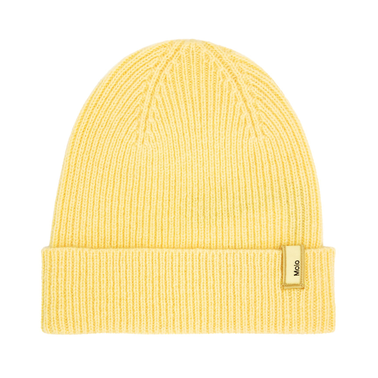 Gul ribstrikket hue i uld med Molo logo.