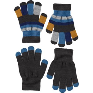 To par strik handsker. Det ene par er grå med blå finger spidser, mens det andet par er stribede.