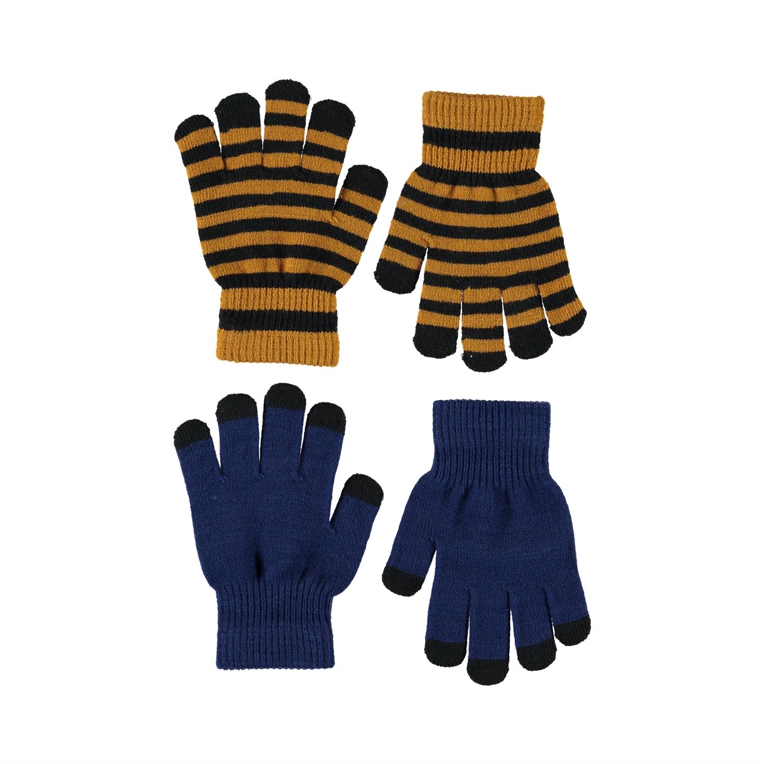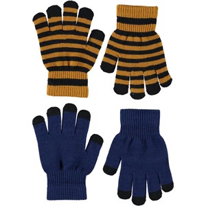 To par strik handsker. Det ene par er blå med mørke finger spidser, mens det andet par er stribede.