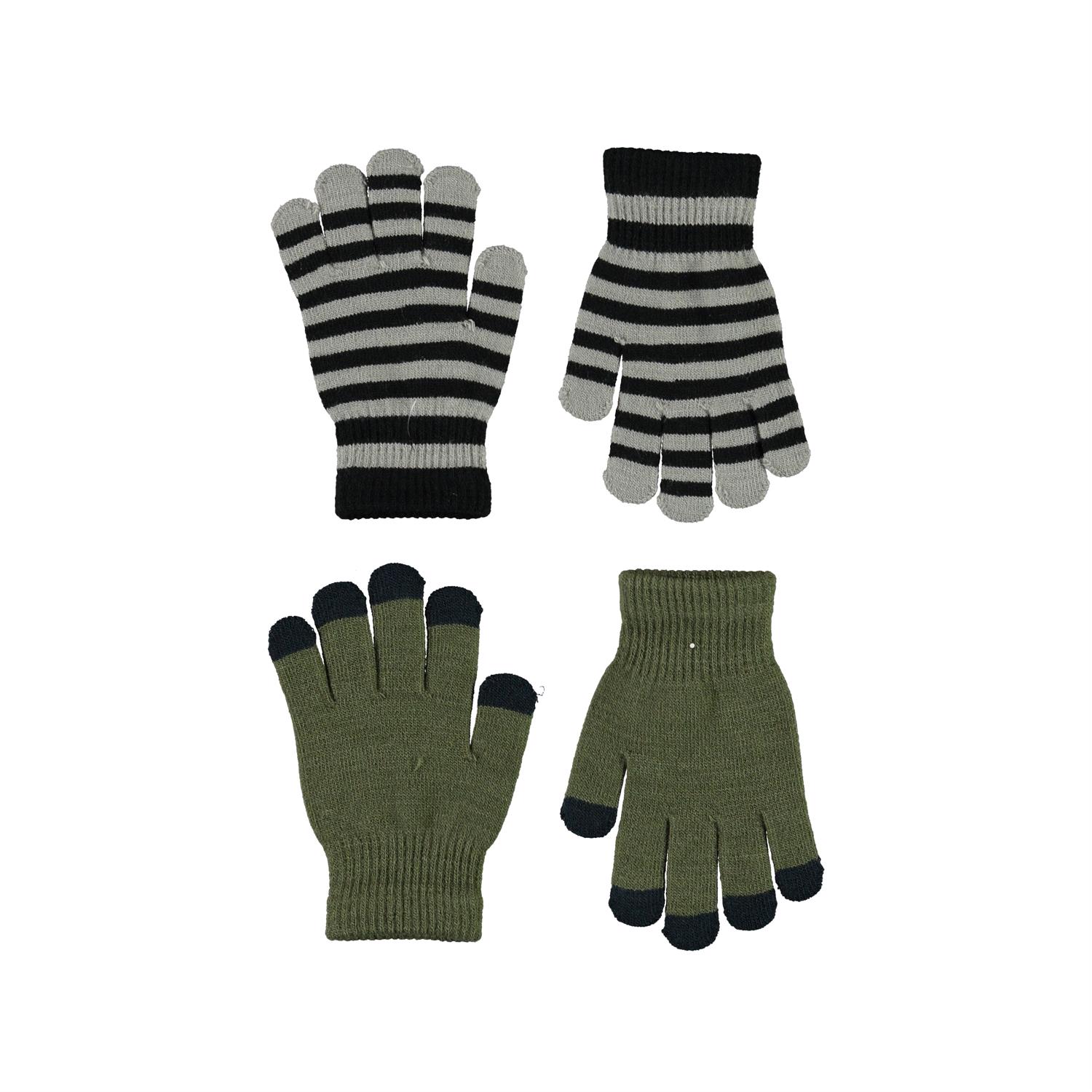 To par strik handsker. Det ene par er grønne med sorte finger spidser, mens det andet par er stribede i sort og grå.