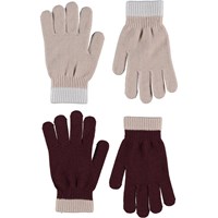 To par strik handsker. Det ene par er gul med lysegrå ved håndleddet, mens det andet er lysrødt.