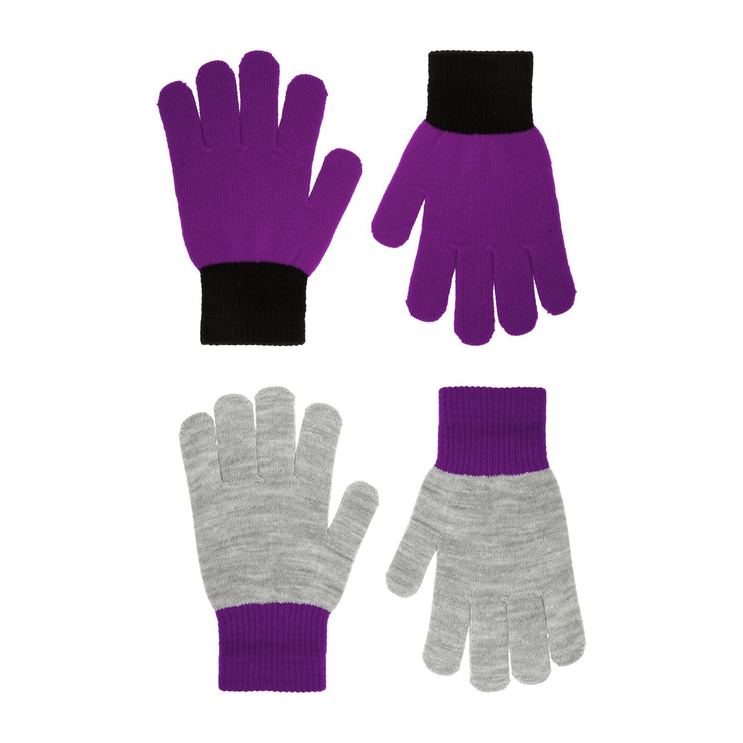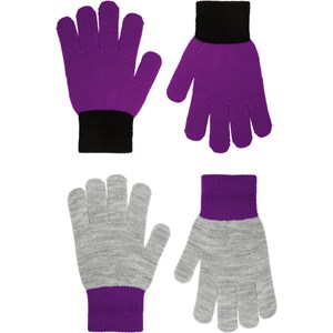 2-pak strikhandsker til lidt større børn, det ene par er lilla med sorte detaljer, mens det andet par er gråt med lilla detaljer. Handskerne har en ribkant om håndledet der gør dem behagelige at have på og ikke glider af hånden.