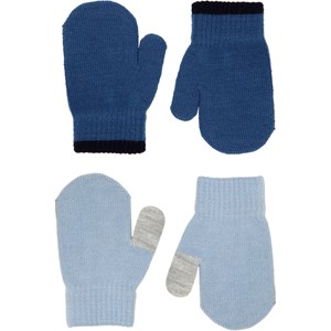 2-pak strikvanter til de mindste i mørkeblå og lyseblå farver. Vanterne har en ribkant om håndledet der gør at de sidder fast og ikke glider af hånden.