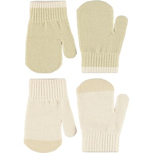 2-pak strikvanter til de mindste i råhvid og beige. Vanterne har en ribkant om håndleddet der gør at de sidder fast og ikke glider af hånden.