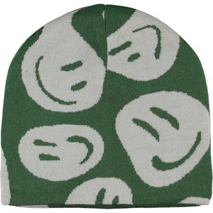 Grøn hue i uldblanding med print af forskellige hvide smiley''er.
