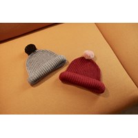 Mørkerød strik hue med opsmøg og lyserød faux fur kvast på toppen.