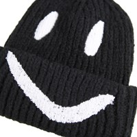 Sort ribstrikket hue med ombuk og broderet smil i hvid.
