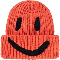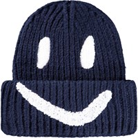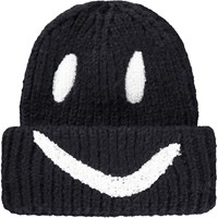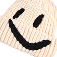 Cremefarvet ribstrikket hue med ombuk og broderet smil i sort.
