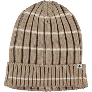 Rib strikket babyhue i mørk beige med smalle hvide striber. Huen har ombuk forneden.