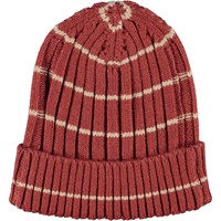 Rib strikket babyhue i rød med smalle beige striber. Huen har ombuk forneden.