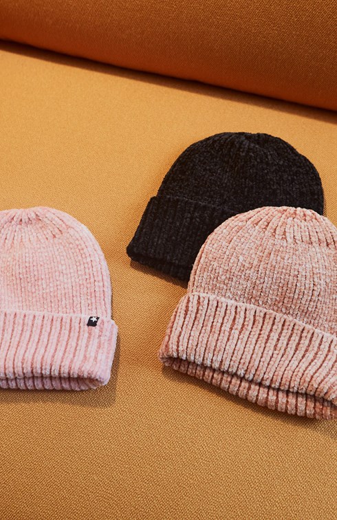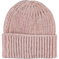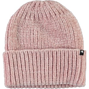 Lyserød vamset og blød hue i flot chenille strik med stort ombuk.