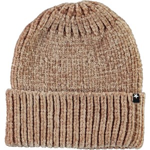 Lysebrun vamset og blød hue i flot chenille strik med stort ombuk.