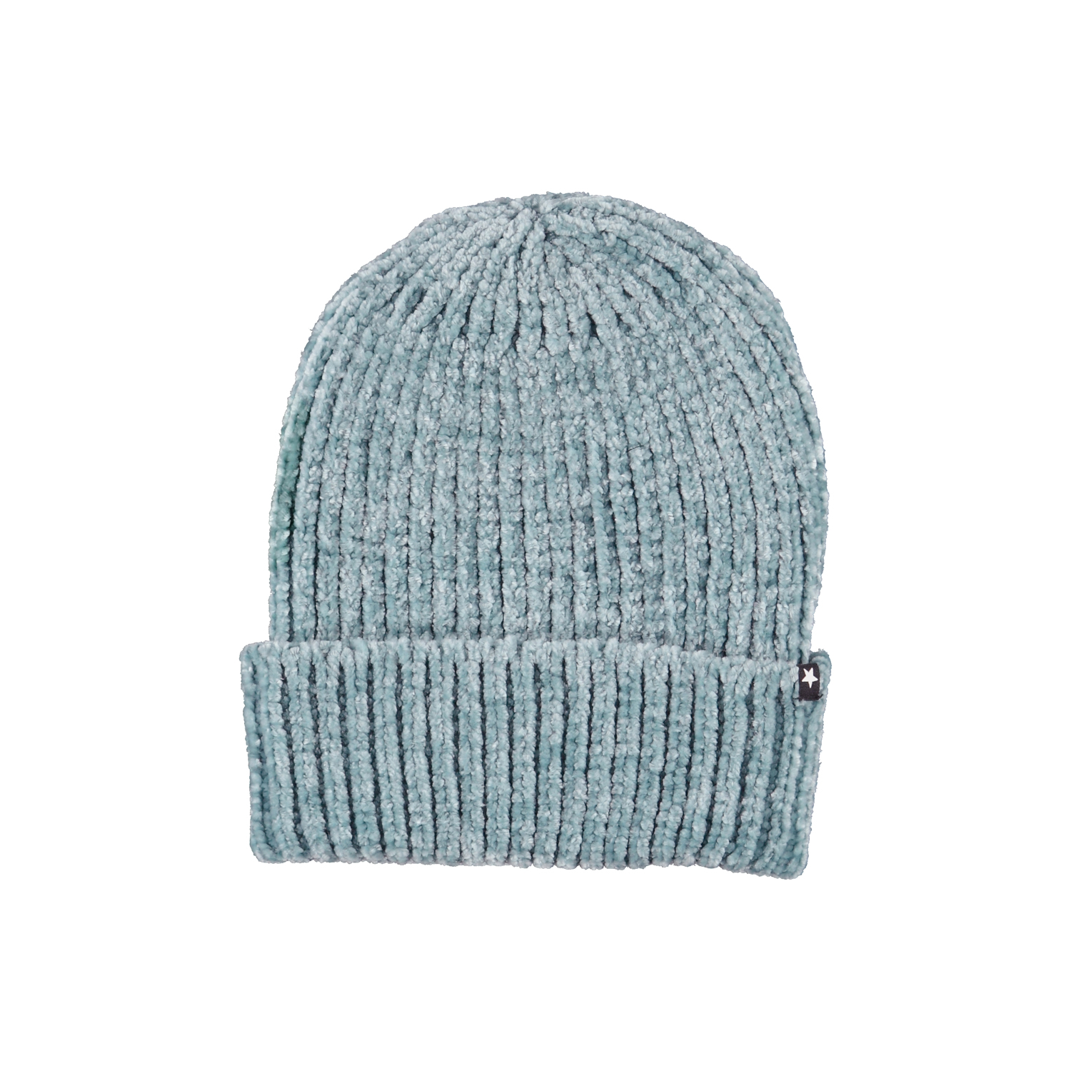 Lyseblå vamset og blød hue. Huen er fremstillet i flot chenille strik og har et stort ombuk.