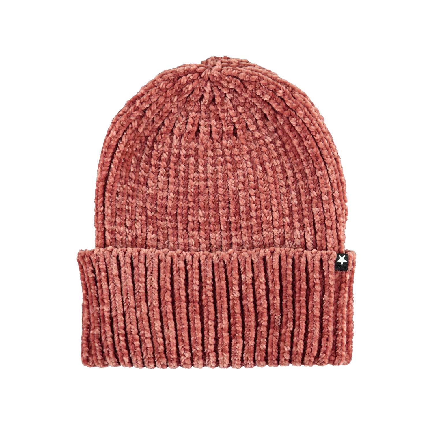 Rød vamset og blød hue i flot chenille strik med stort ombuk.
