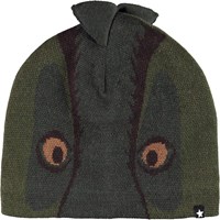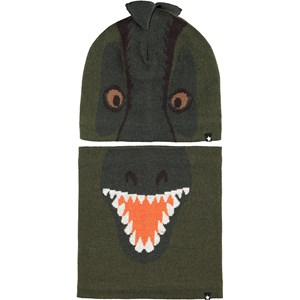 Grøn hue og halsrør i uldmix med motiv af en krokodille, som er fordelt på både huen og halsrøret.