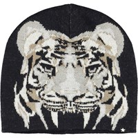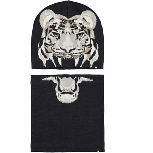Mørkeblå hue og halsrør i uldmix med motiv af en farlig tiger, som er fordelt på både huen og halsrøret.