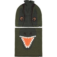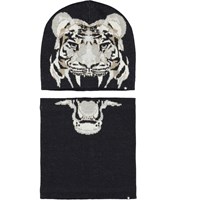 Grå hue og halsrør i uldmix med motiv af en sød vaskebjørn, som er fordelt på både huen og halsrøret.